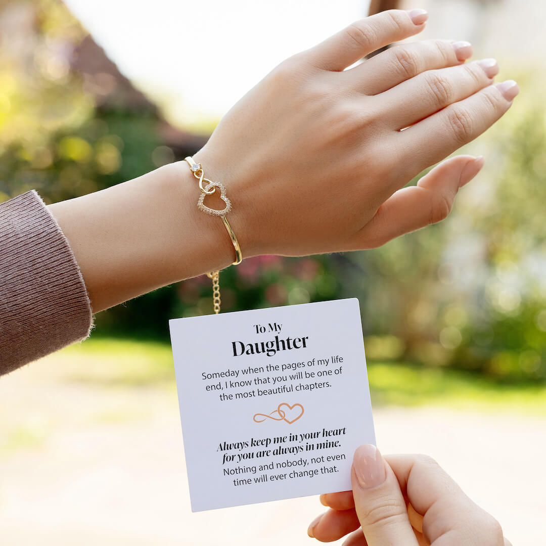 A symbol of the undying LOVE between a mother and daughter. Crafted with an interlocking infinity and heart pendant, it embodies endless love and cherished moments. Each bracelet comes paired with a heartfelt message card: "To My Daughter, someday when the pages of my life end, I know you'll be one of the most beautiful chapters. Always keep me in your heart, for you are always in mine." This bracelet isn't just an accessory; it's a keepsake of promises, memories, and a love that knows no bounds.